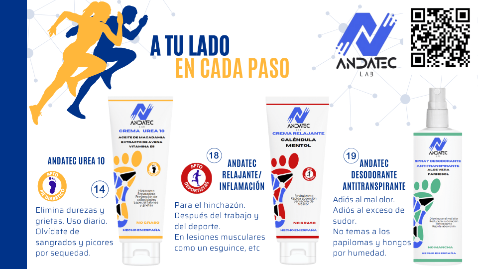 En Andatec nos especializamos en productos podológicos de cuidado diario, creados para asegurar el bienestar y la salud de los pies. Nuestro catálogo abarca cremas, desodorantes y sprays especialmente formulados para el cuidado de tus pies. Todos nuestros productos están disponibles exclusivamente en farmacias y clínicas especializadas, garantizando un enfoque profesional y eficaz en el cuidado podológico.